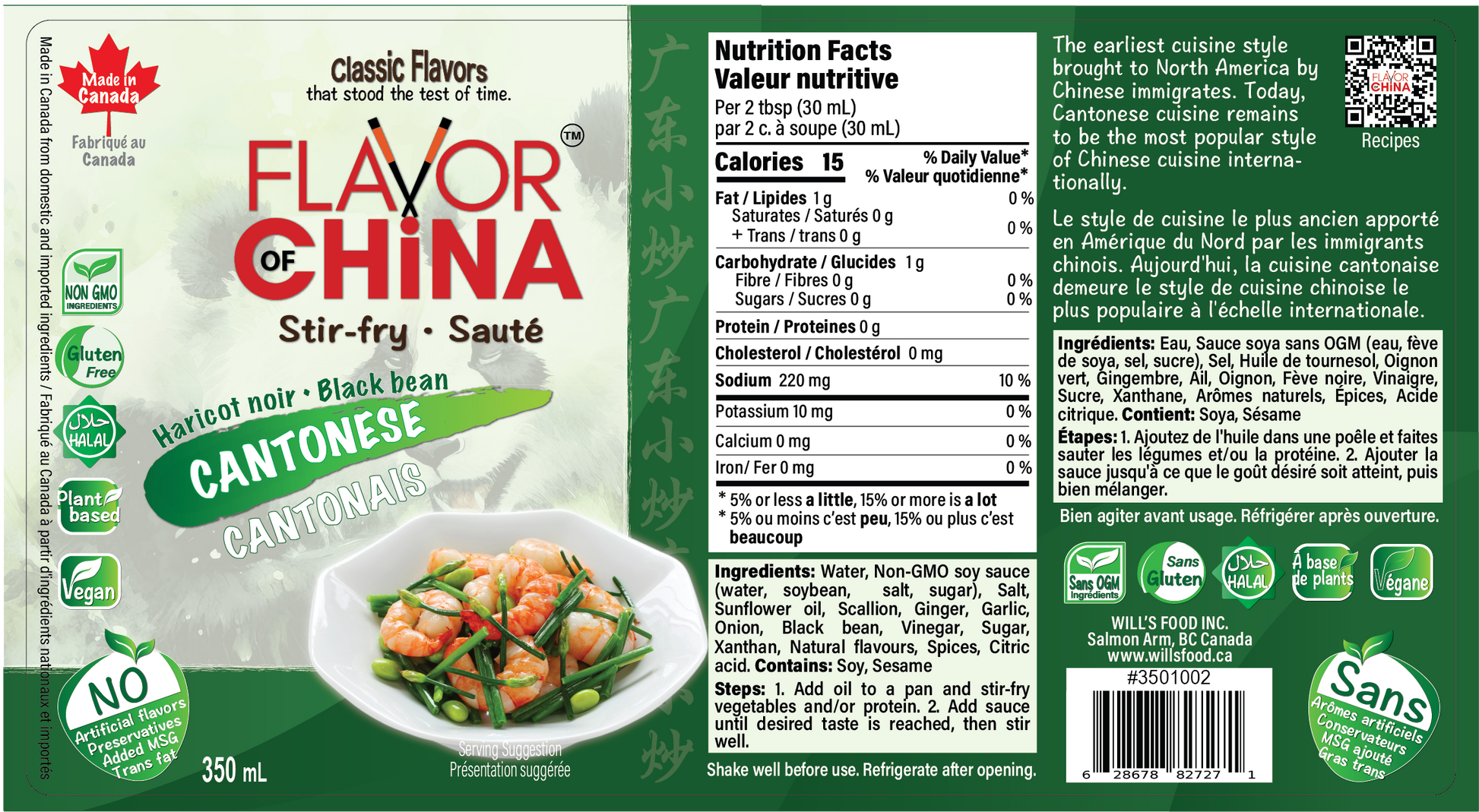 Water, Non-GMO soy sauce (water, soybean, salt, sugar), Salt, Sunflower oil, Scallion, Ginger, Garlic, Onion, Black bean, Vinegar, Sugar, Xanthan, Natural flavours, Spices, Citric acid