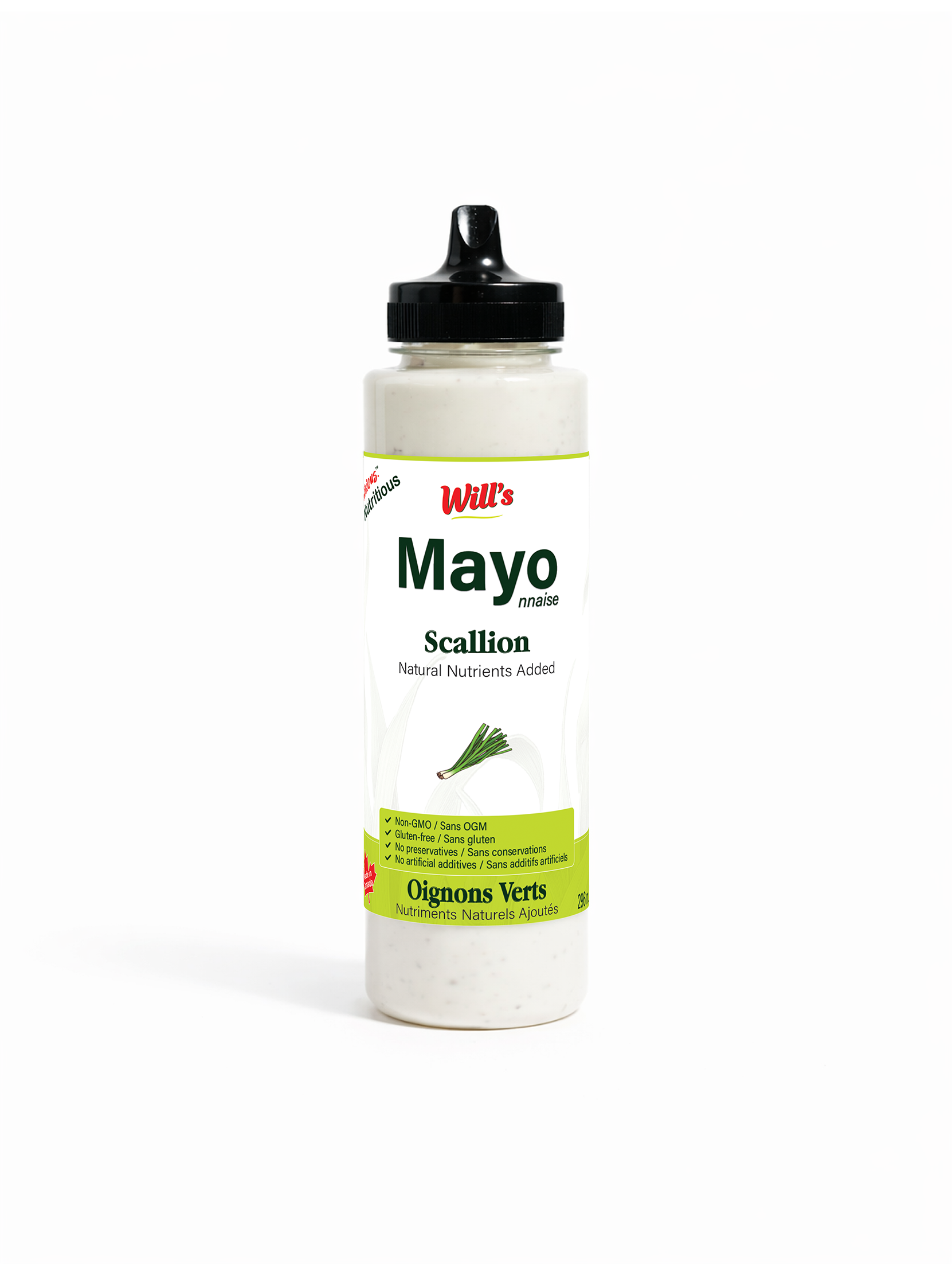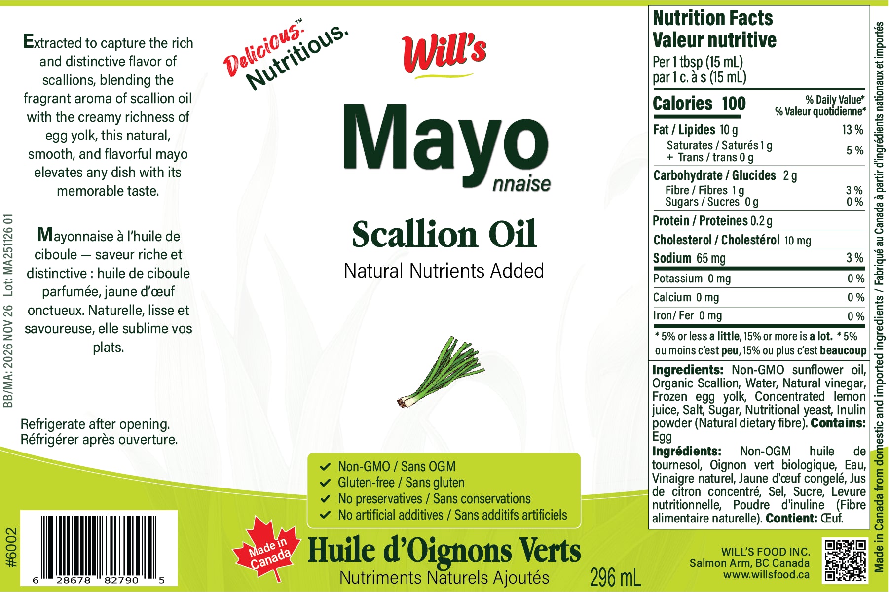 Non-GMO sunflower oil, Organic Scallion, Water, Natural vinegar, Frozen egg yolk, Concentrated lemon juice, Salt, Sugar, Nutritional yeast, Inulin powder (Natural dietary fibre)