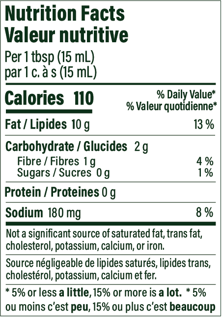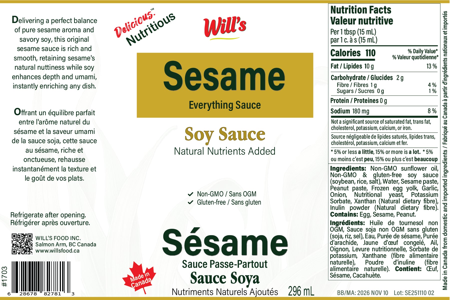 Non-GMO sunflower oil, Non-GMO & gluten-free soy sauce (soybean, rice, salt), Water, Sesame paste, Peanut paste, Frozen egg yolk, Garlic, Onion, Nutritional yeast, Potassium Sorbate, Xanthan (Natural dietary fibre), Inulin powder (Natural dietary fibre).